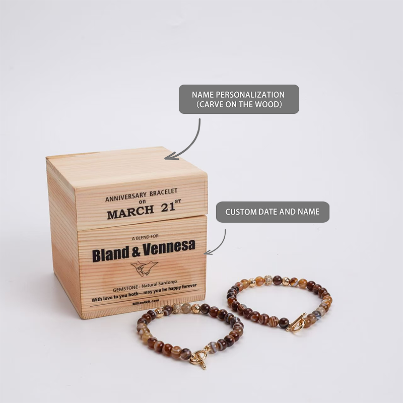 The wooden gift box lid can be engraved with your names and anniversary date.