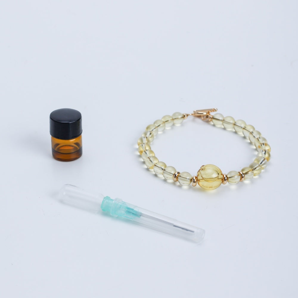 The essential oil bottle shown in the image has a 10ml capacity, while the complimentary bottle included with the scented bracelet is 1ml in size.