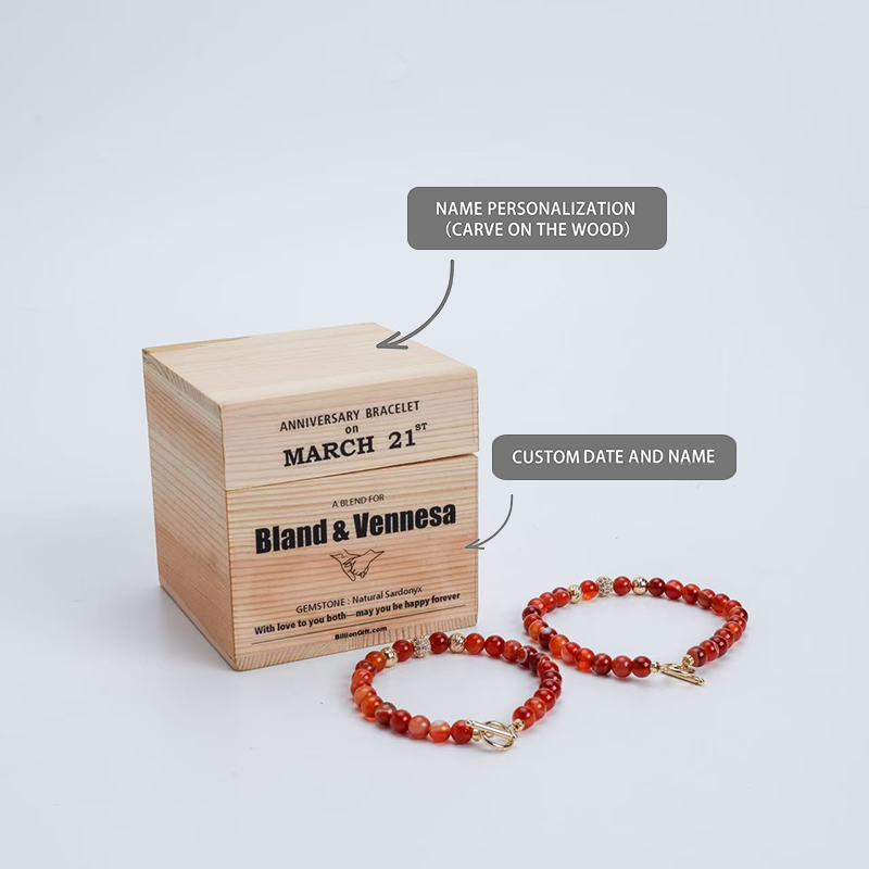 The wooden gift box lid can be engraved with your names and anniversary date.